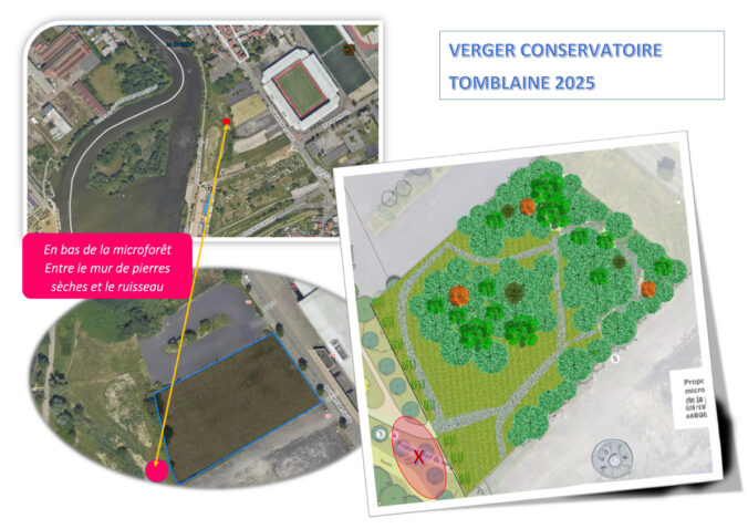 Sa réalisation vous avait été annoncée pour 2025… C’est fait, le service municipal « environnement » vient de le réaliser du 8 au 10 décembre. Ce verger lorrain de 400 m² est implanté dans l’espace public, entre la micro forêt de 2500 m2 que la population de Tomblaine avait plantée en 2024 et la Meurthe. Ce verger fera la liaison entre le mur de pierres et la nouvelle passerelle permettant d’accéder à la Plage des deux Rives.