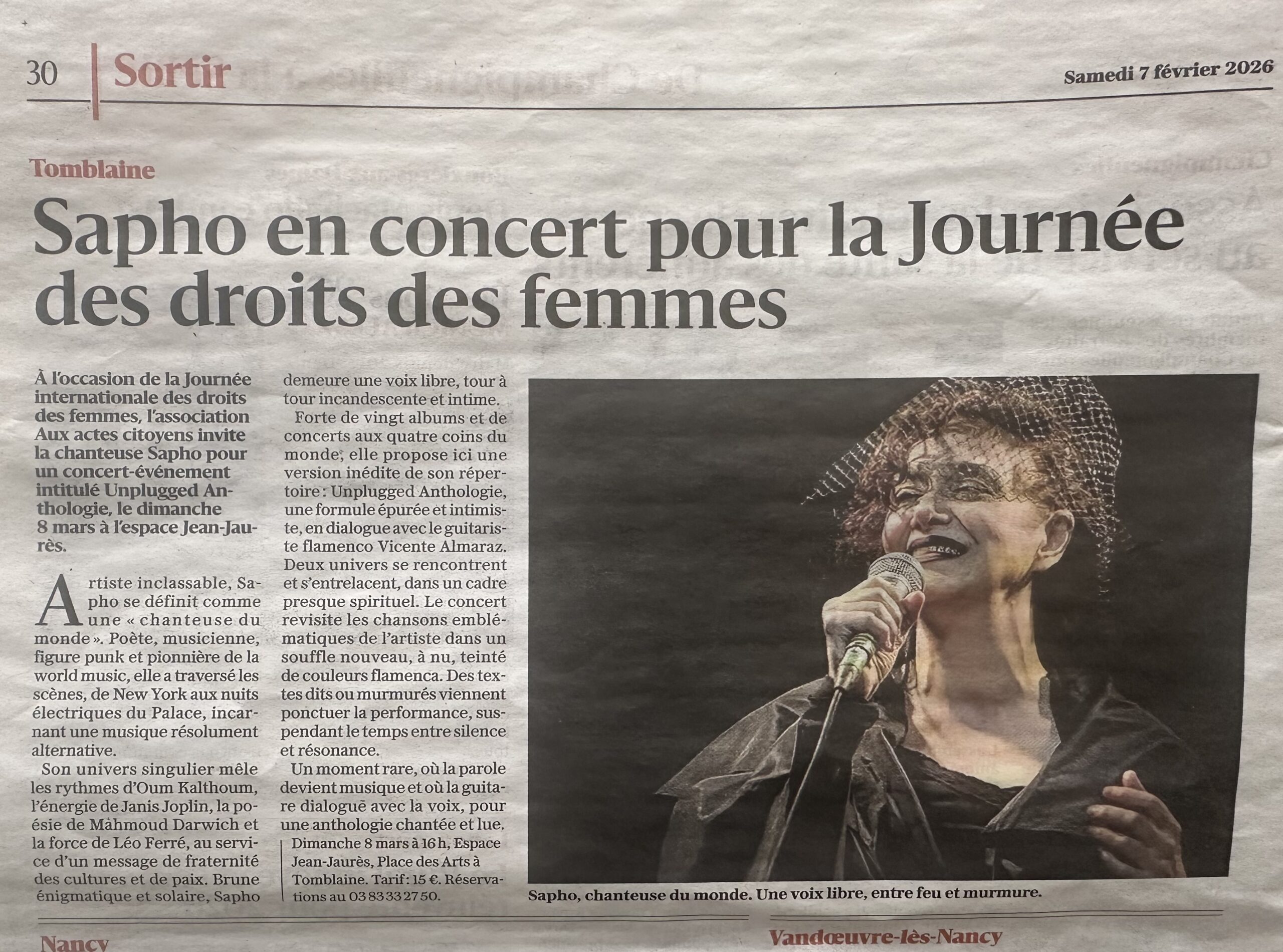 L’évènement à Tomblaine.Le dimanche 8 mars à 18h : Journée Internationale des Droits des Femmes : Sapho en concert !